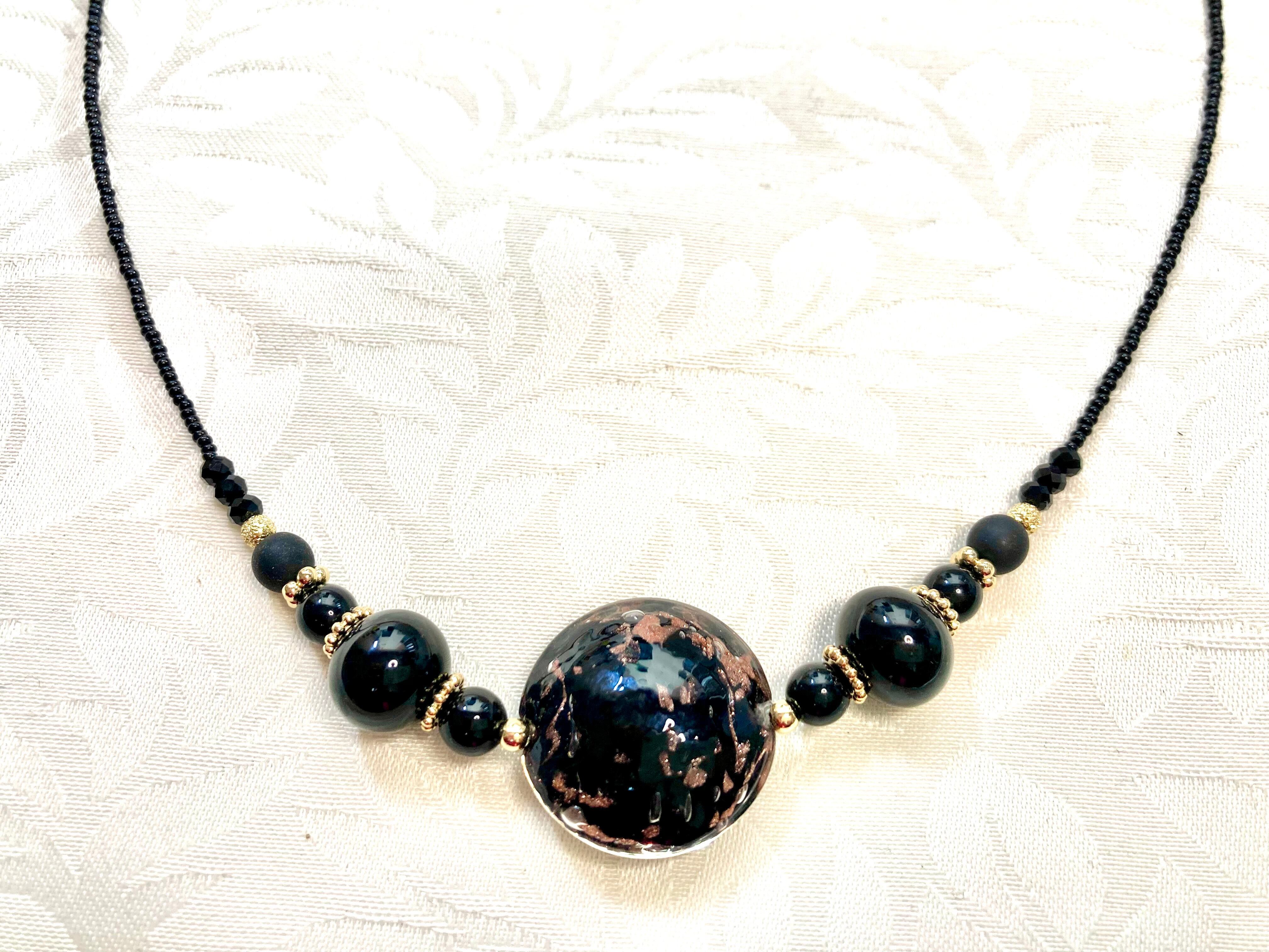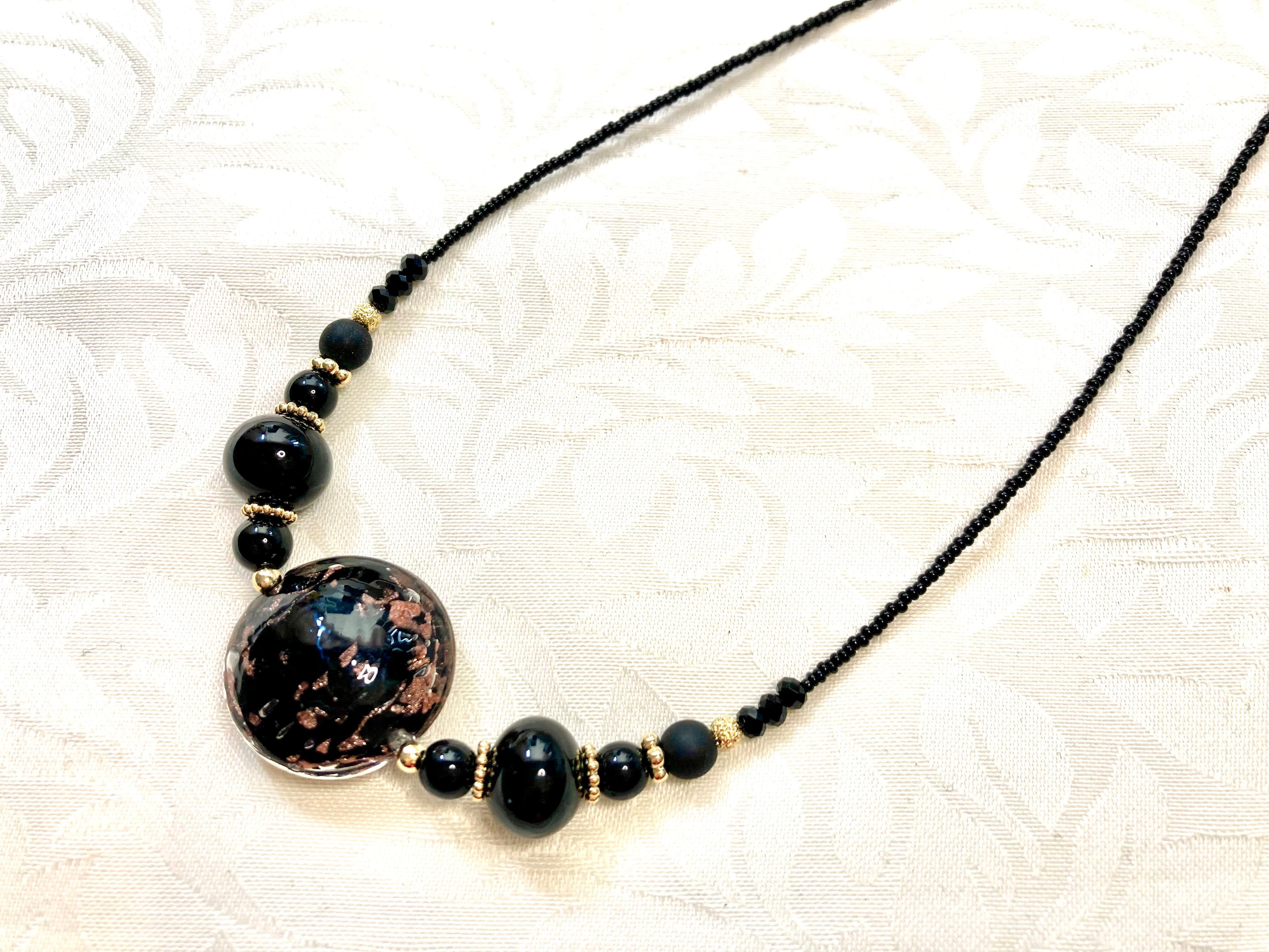 黒のスキッサ型ヴェネチアンガラスにアベンチュリーナを使用したネックレスが登場しました!
