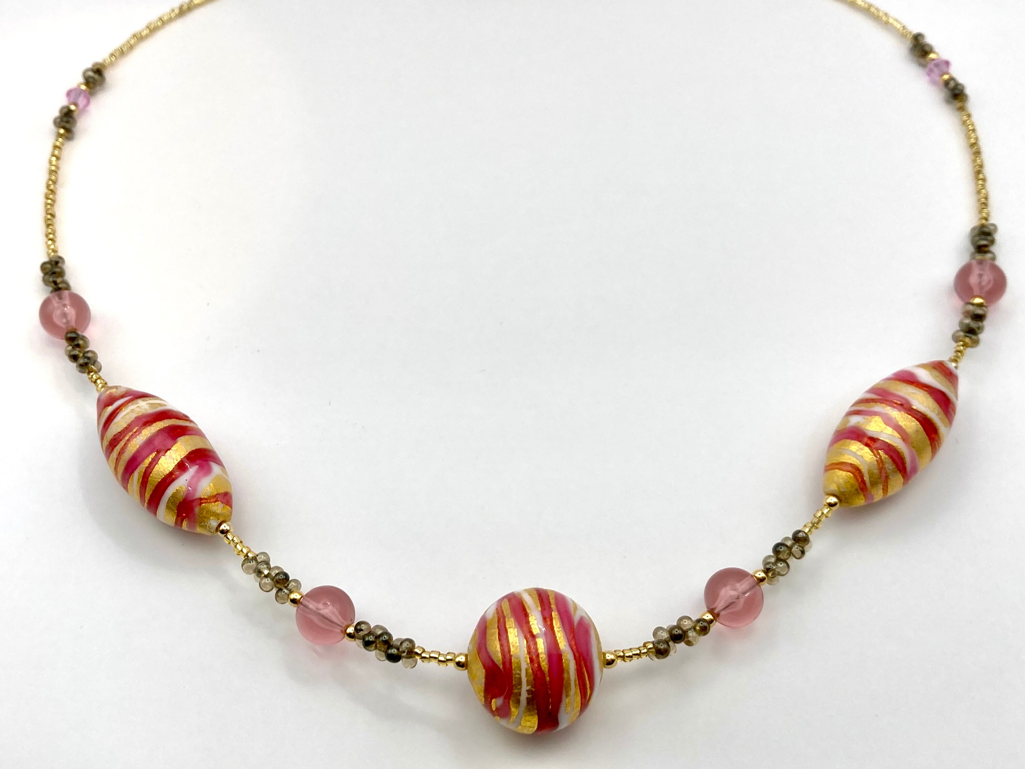 美しい螺旋模様が魅力のネックレスが新登場!49cmの絶妙な長さで、首元に洗練された印象を与えます。ローズ色の優しいトーンと金箔の輝きが心を惹きつけ、どんなスタイルにも華やかさをプラスします。カジュアルな日常のコーディネートから特別な場面まで、幅広くお楽しみいただけるアイテムです。