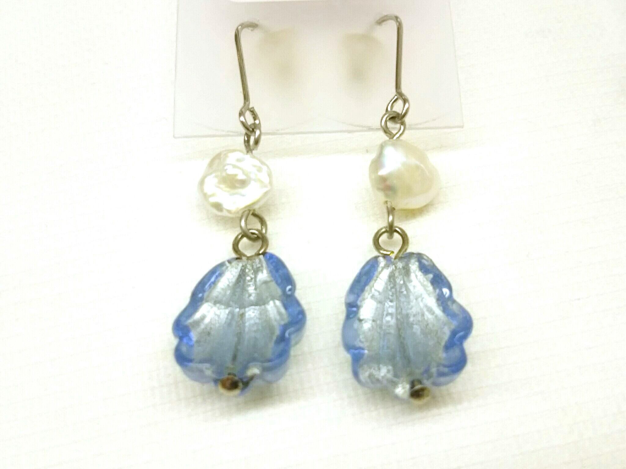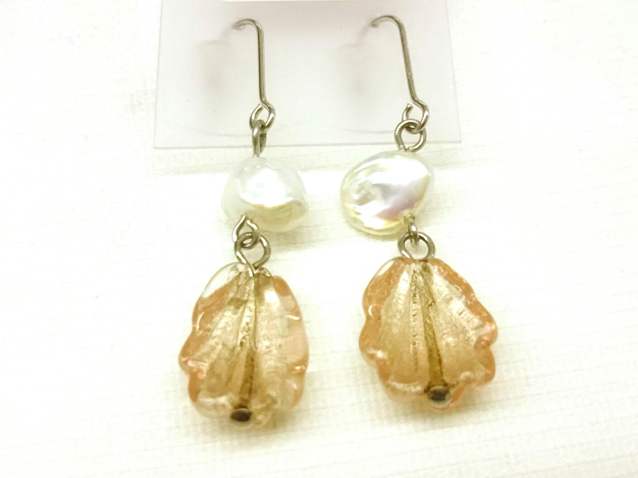 ヴェネチアン シェル型15×12mmと淡水パールで作り上げたピアスです。