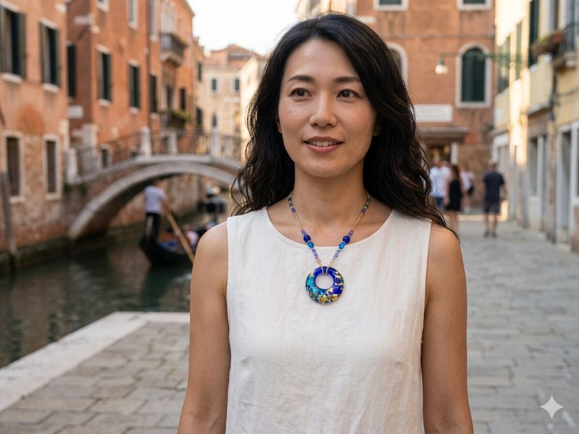 エレガントで洗練されたデザインが特徴のネックレス「Anello della Laguna(アネッロ・デッラ・ラグーナ)」は、神秘的な水面を表現したヴェネチアンガラスによって、あなたの魅力を一層際立たせます。流れるようなラインのデザインは、デコルテを美しく演出し、特別な日のおしゃれの他、デイリーユースにも最適です。シンプルながらも存在感のあるアイテムで、あらゆるシーンに華やかさを添える一品です。
