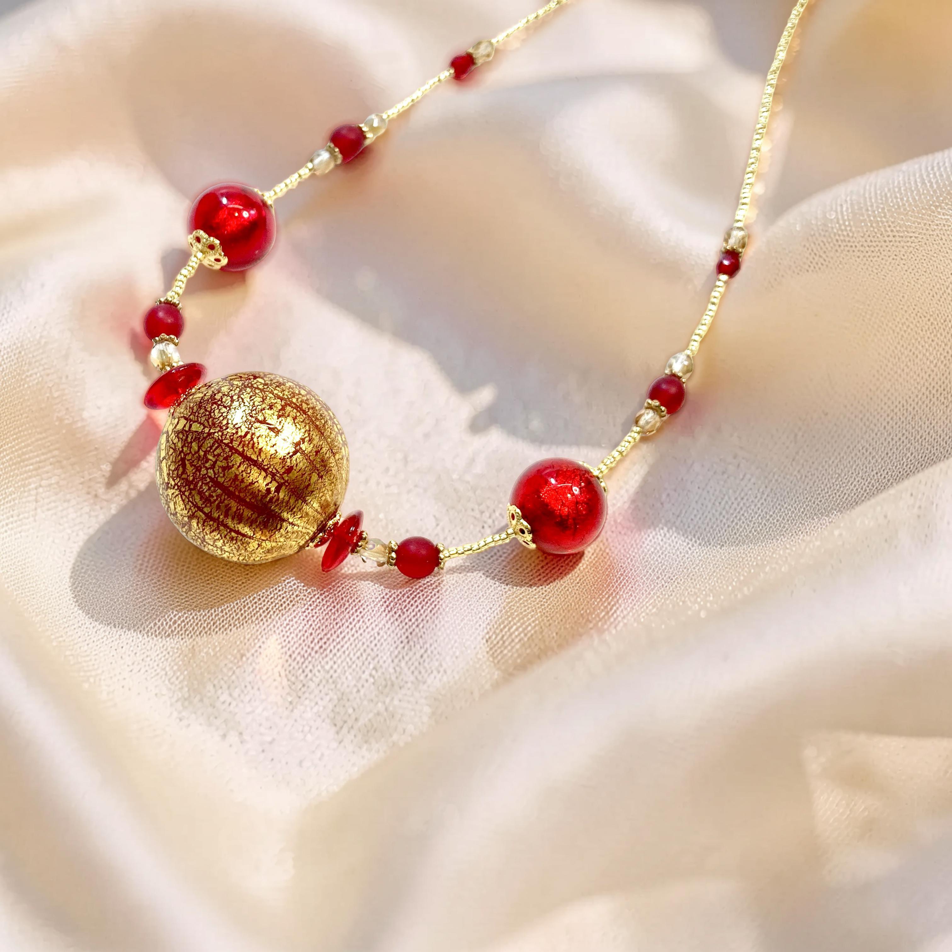 エレガントで洗練されたデザインが特徴のネックレス「Tesoro Veneziano(テゾーロ・ヴェネツィアーノ)」は、ヴェネチアンガラスの吹きガラス製のトップが華やかさを添え、あなたの魅力を一層引き立てます。繊細なカーブを描くデザインは、デコルテを美しく演出し、特別な日の装いだけでなく、日常使いにも最適です。シンプルでありながらも、印象的な存在感を放つアイテムで、さまざまなシーンに彩りを加えてくれる一品です。