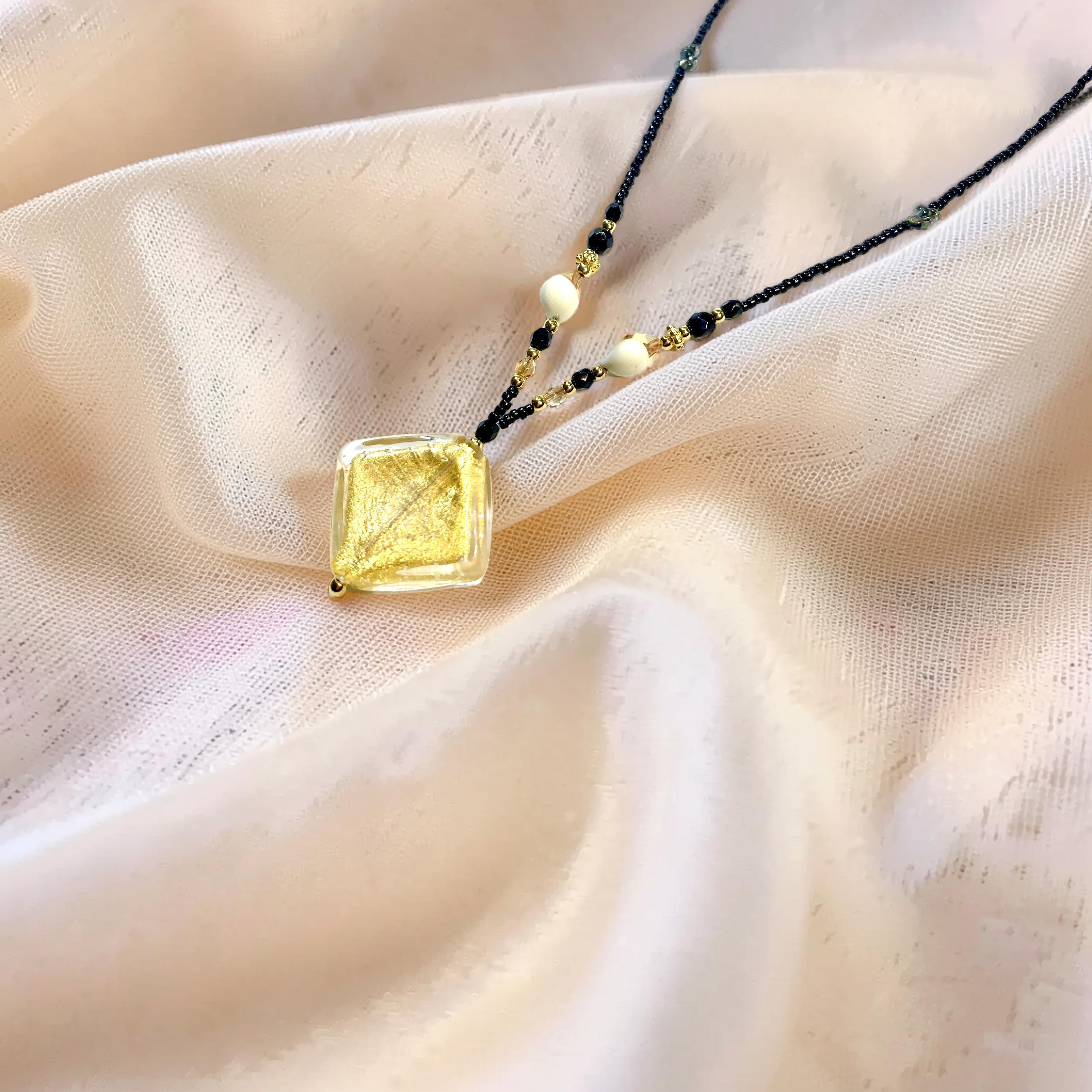 エレガントで洗練されたデザインが特徴のネックレス「Luce Preziosa(ルーチェ・プレツィオーザ)テゾーロ」は、神秘的な輝きを放つヴェネチアンガラスによって、あなたの魅力を一層引き立てます。流れるようなラインがデコルテを華やかに飾り、特別な日の装いはもちろん、日常のスタイルにも上品さを添える一品です。シンプルさの中に独自の存在感があり、多彩なシーンであなたを輝かせます。