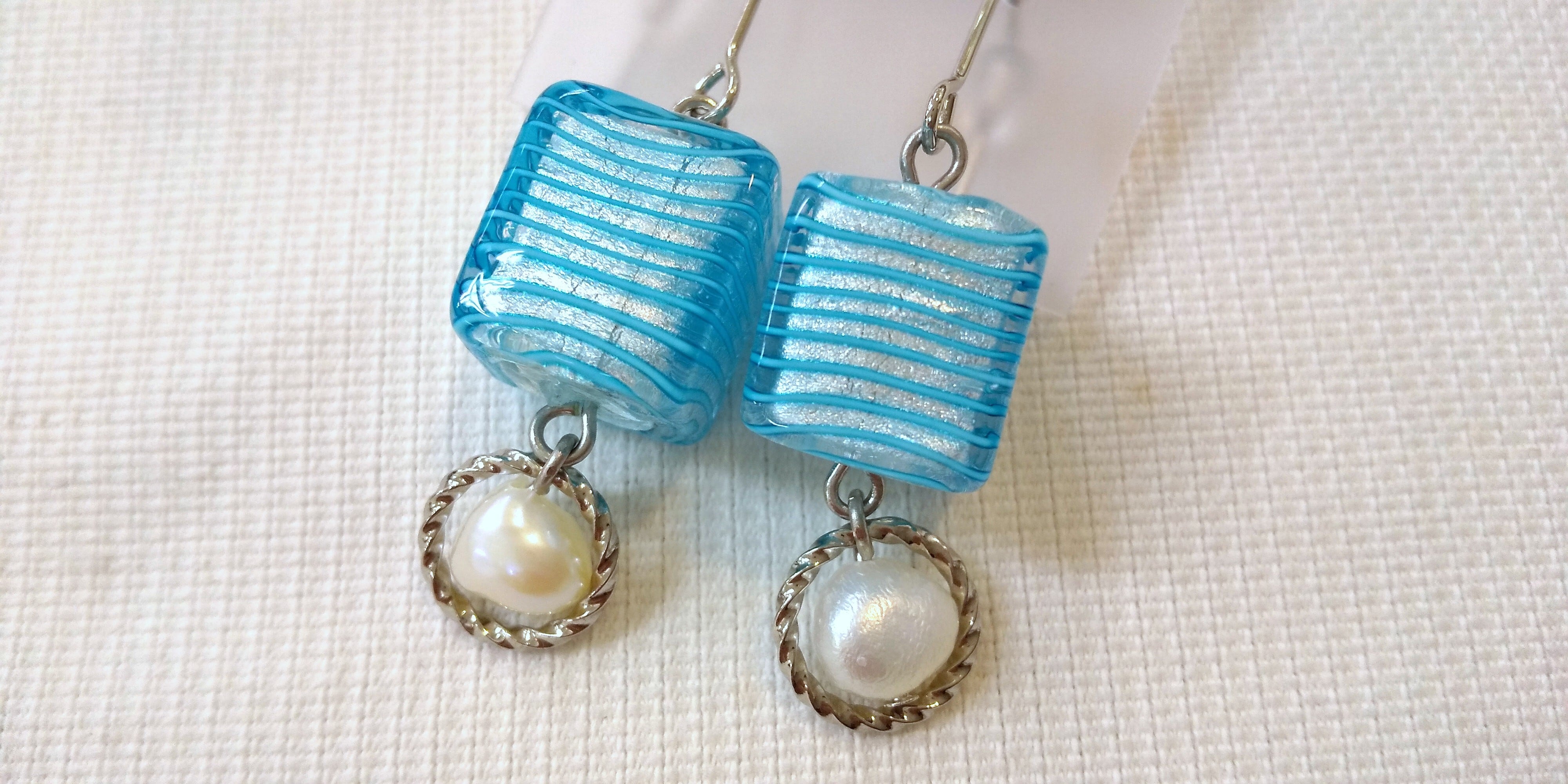 ヴェネチアン キューブ11×11mmと淡水パール、リングパーツを使っています
