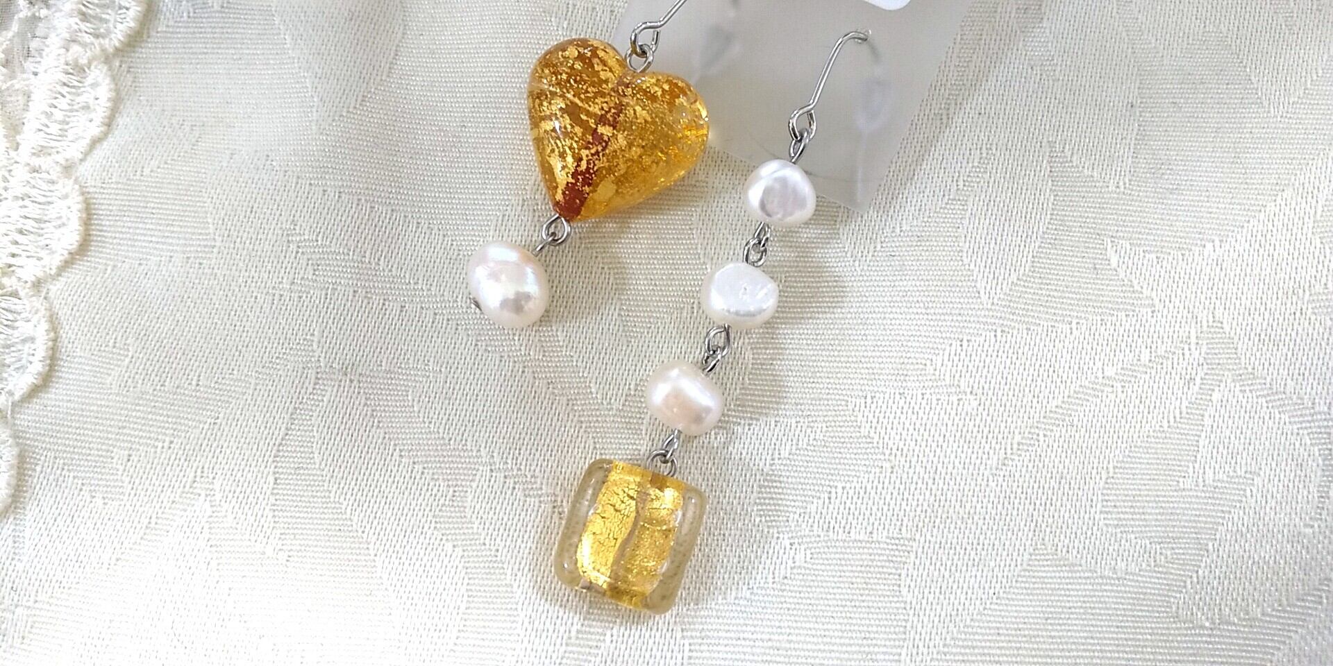 【ピアス/イヤリング】アシンメトリー ヴェネチアン×淡水パール ハート