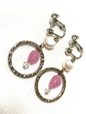 ヴェネチアン ポテト10×6mmと淡水パール、スワロフスキー、メタルリング21mm17mm使ったピアスです。